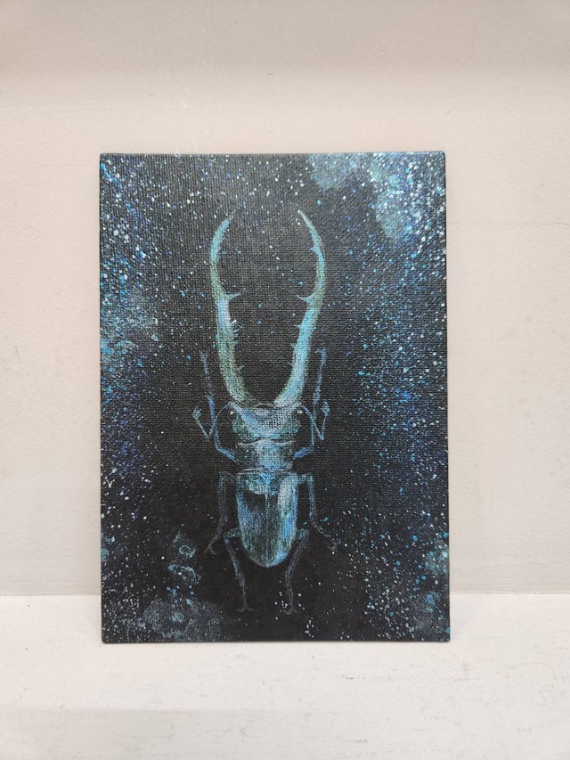 インドネシアの熱帯雨林に生息するメタリフェルホソアカクワガタ。その長く優美な顎と神秘的な金属光沢に魅了され、その美しさをキャンバスに封じ込めた作品です。ただの昆虫画ではなく、メタリックカラーで彩られた体は、見る角度によって輝きが変化する、まるで宝石のような存在感を放ちます。 ※商品画像はお客様のご閲覧の環境によって、色味など実物と若干の違いが生じます。 ※掲載写真の中で複数の作品が並んでいるものもございますが、販売対象は本作品1点となります。 ・画材:キャンバスボード、アクリル絵具 ・サイズ:18cm×12.5cm ・制作年:2025年