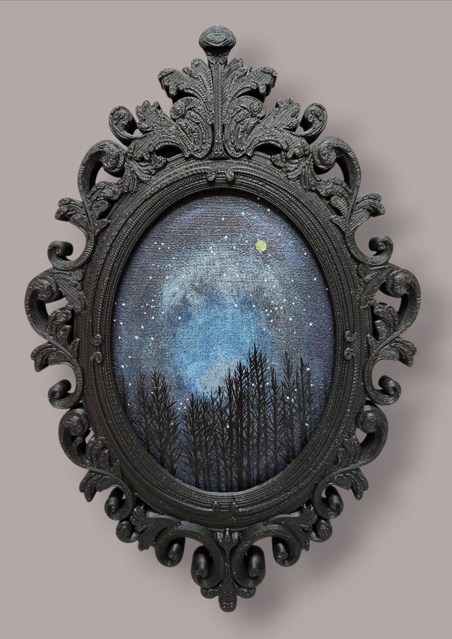 澄み切った夜空と森が織りなす、神秘的な静寂のアート 凍てつくような冬の夜、空気が澄み渡り、無数の星々が瞬く森の情景を描いた作品です。この絵を前にすると、まるでその場所に佇んでいるかのような空気感と、森の奥深くへと誘われる神秘的な感覚に包まれます。日々の喧騒から離れ、静かに心を落ち着けたい瞬間に、深く寄り添ってくれるでしょう。 小さな画面に緻密に描かれた樹木、そしてメタリックカラーで表現された空や星々が、作品全体に幻想的で深みのある輝きをもたらしています。実物をご覧いただくと、その輝きはさらに増し、深みのある立体感と高級感を感じていただけます。 他にはないこの作品が、日々の生活に深い安らぎとインスピレーションを与えてくれるはずです。ぜひこの機会に、神秘的な森の情景をあなたの空間にお迎えください。 ※商品画像はお客様のご閲覧の環境によって、色味など実物と若干の違いが生じます。 ※商品内容には額縁も含まれます。 ・画材:板、アクリル絵具 ・サイズ:13.5cm×20cm ・制作年:2025年