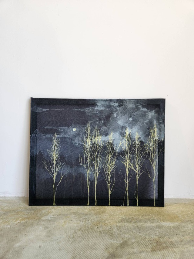 月明かりに照らされた樹木は、雲に覆われてもなお静かに輝き続けます。その凛とした姿は、生命の力強さや美しさを象徴し、鑑賞する人やその大切な人の姿と重ね合わせて感じることができるでしょう。 本作はオーガンジーを用いた二重構造によって奥行きが生まれ、光や背景によって異なる表情を見せます。柔らかな透け感が加わることで、幻想的な雰囲気と深い余韻を空間にもたらします。 ダイニングに飾れば語らいの場を優しく包み込み、書斎では静かな集中をもたらす存在に。玄関や廊下に置けば、訪れる人の目を引きつけ、印象的な空間を演出します。シーンに合わせて、その魅力が自在に変化するのも本作の魅力です。 なお、本作品は透け感のあるオーガンジー素材を使用しているため、掛ける背景の色や照明環境によって印象が大きく変わります。明るい壁に飾れば清らかな印象に、濃い壁や木目の背景では幻想的で深みのある雰囲気に。お部屋に合わせて変化を楽しんでいただけます。 ※商品画像はお客様のご閲覧の環境によって、色味など実物と若干の違いが生じます。 ・画材:オーガンジー、アクリル絵具、ペン ・サイズ:40cm×50cm×1.5cm ・制作年:2025年