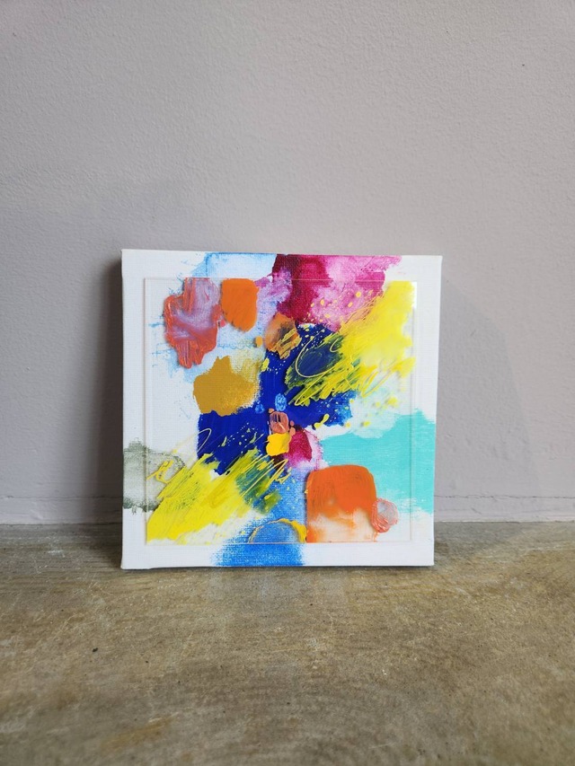 キャンバスの上に広がる鮮やかな色彩と、アクリル板を組み合わせることで生まれた奥行きと透明感。アクリル絵の具の自由な表情が、心の移ろいをやわらかく映し出しています。 光の加減や見る角度によって印象が変わるため、ただ眺めるだけで新しい発見があり、日常の中に小さな感動をもたらしてくれるでしょう。シンプルな色だけではなく、異素材を掛け合わせることで作品に独自の面白みが加わり、空間に現代的なアクセントを与えます。 1枚だけで存在感を放つのはもちろん、複数を並べれば色と光が連なり、インスタレーションのような雰囲気に。リビングやワークスペースに飾れば、日々の暮らしに心地よい刺激と洗練された彩りを添えてくれる一枚です。 ※商品画像はお客様のご閲覧の環境によって、色味など実物と若干の違いが生じます。 ※掲載写真の中で複数の作品が並んでいるものもございますが、販売対象は本作品1点となります。 ・画材:キャンバス、アクリル板、アクリル絵具 ・サイズ:15cm×15cm ・制作年:2024年