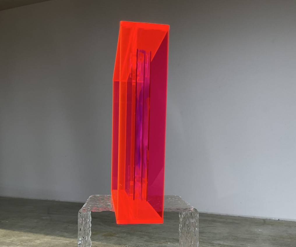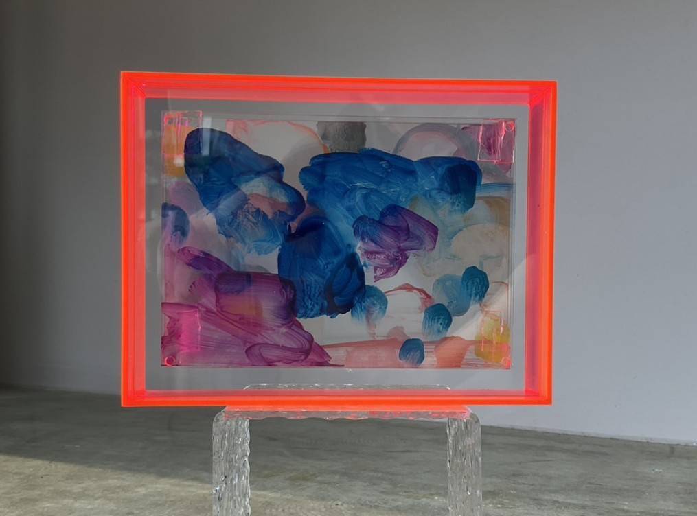 透明なアクリル板を3枚重ねて描くことで、シンプルな中に奥行きが生まれ、小さな画面の中に広がりと立体感を持たせました。絵の具の色彩が層ごとに重なり合い、見る角度や光の加減で印象が少しずつ変わっていきます。
