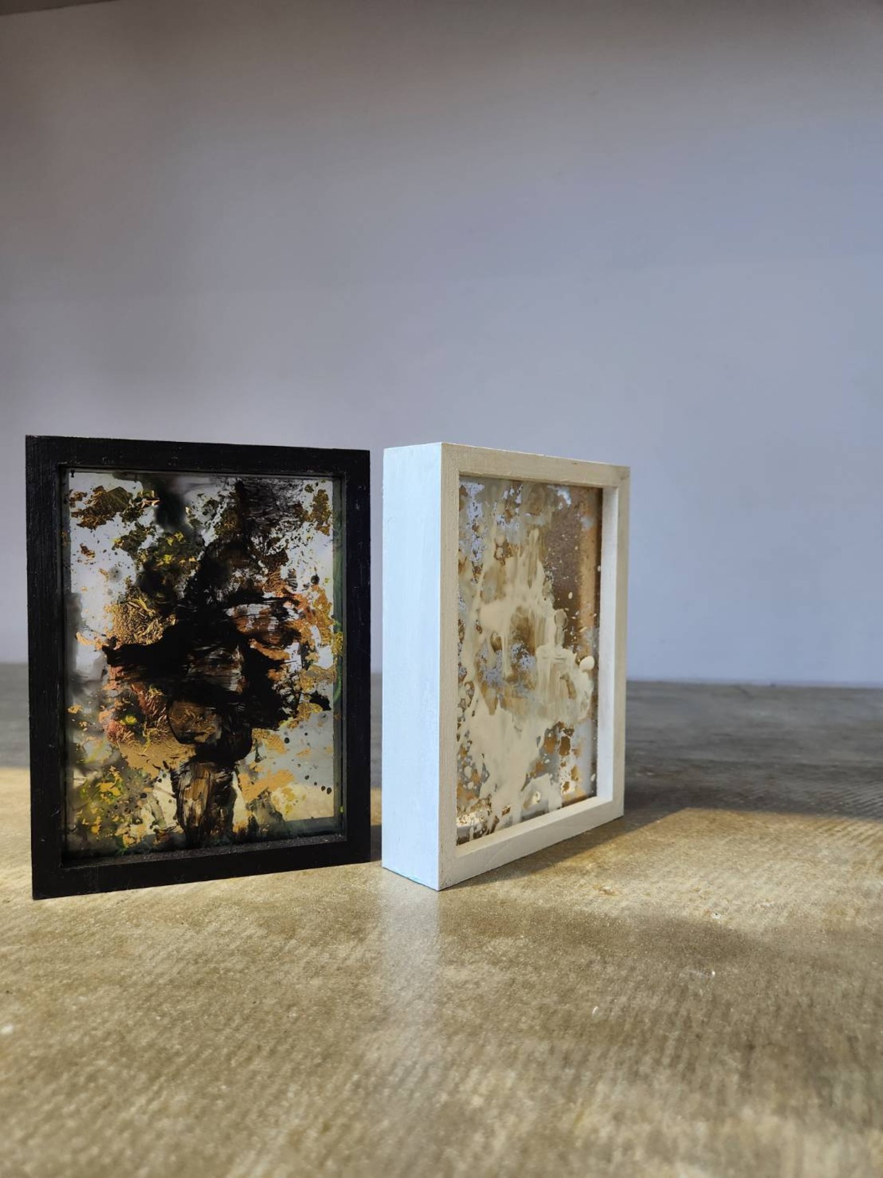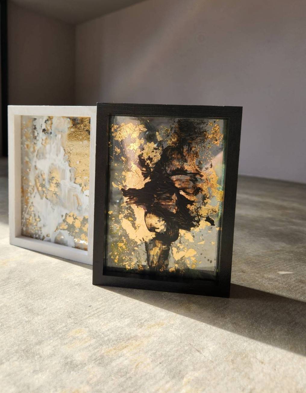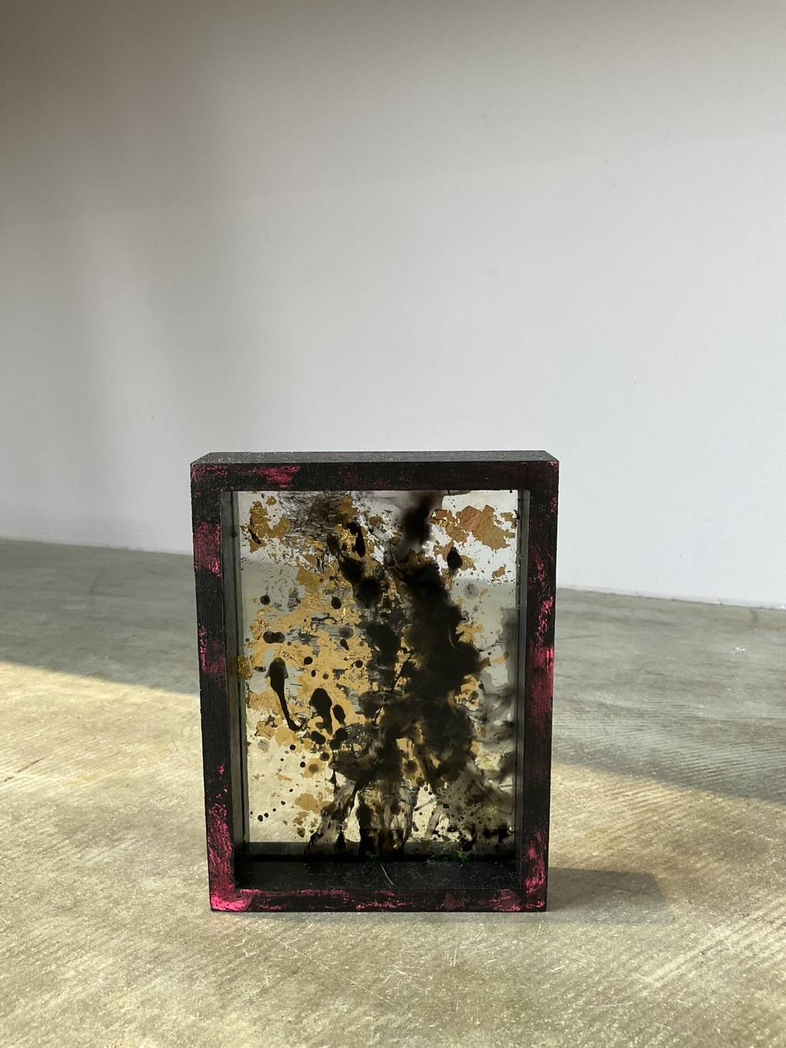 透明なアクリル板に、アクリル絵具と洋金箔で描かれた本作は、まるでガラスの中に「影のアート」を封じ込めたような存在感を放ちます。