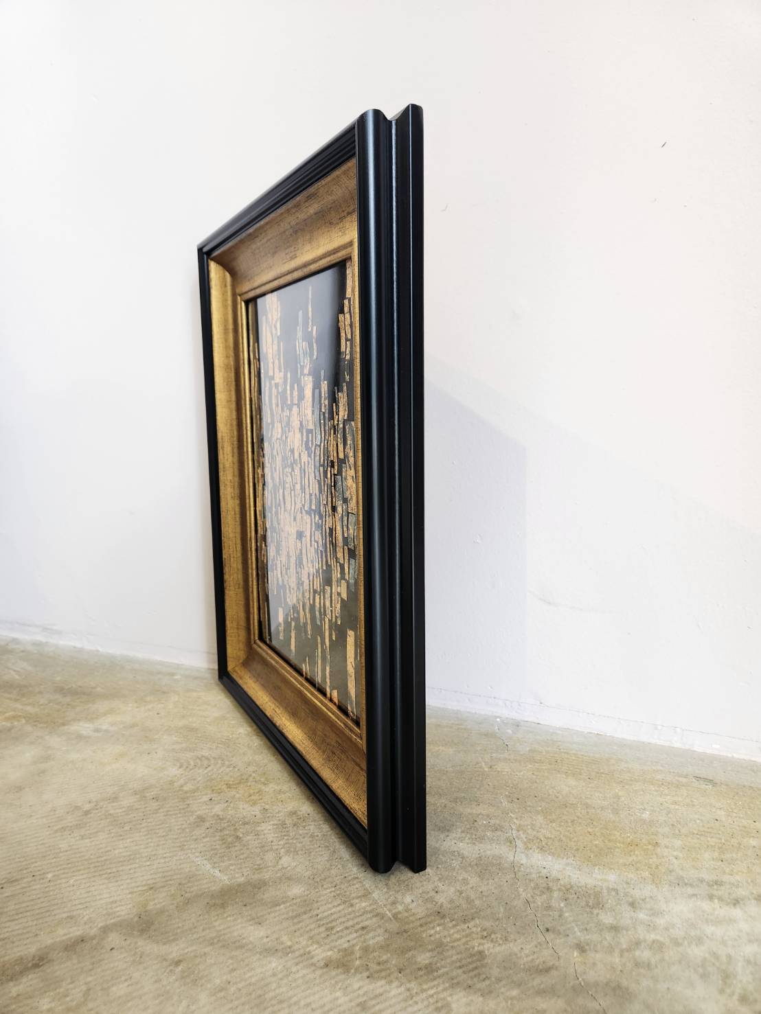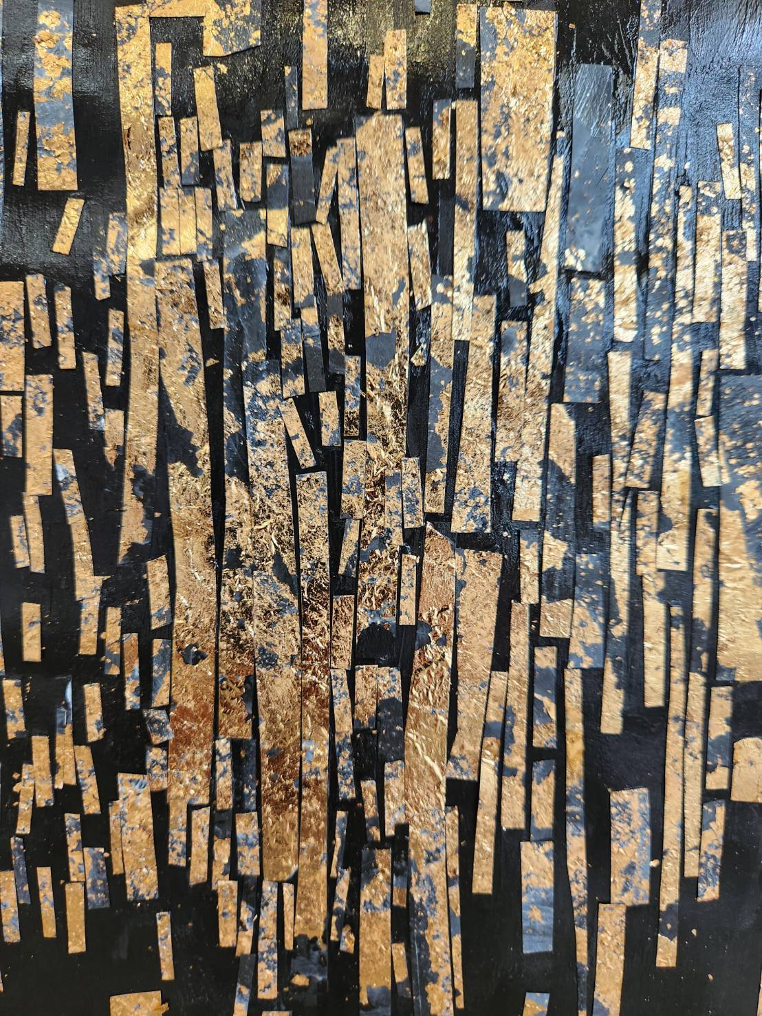 このコラージュ作品は、ゴールドとブラックの華やかな対比を融合させた一点もの。