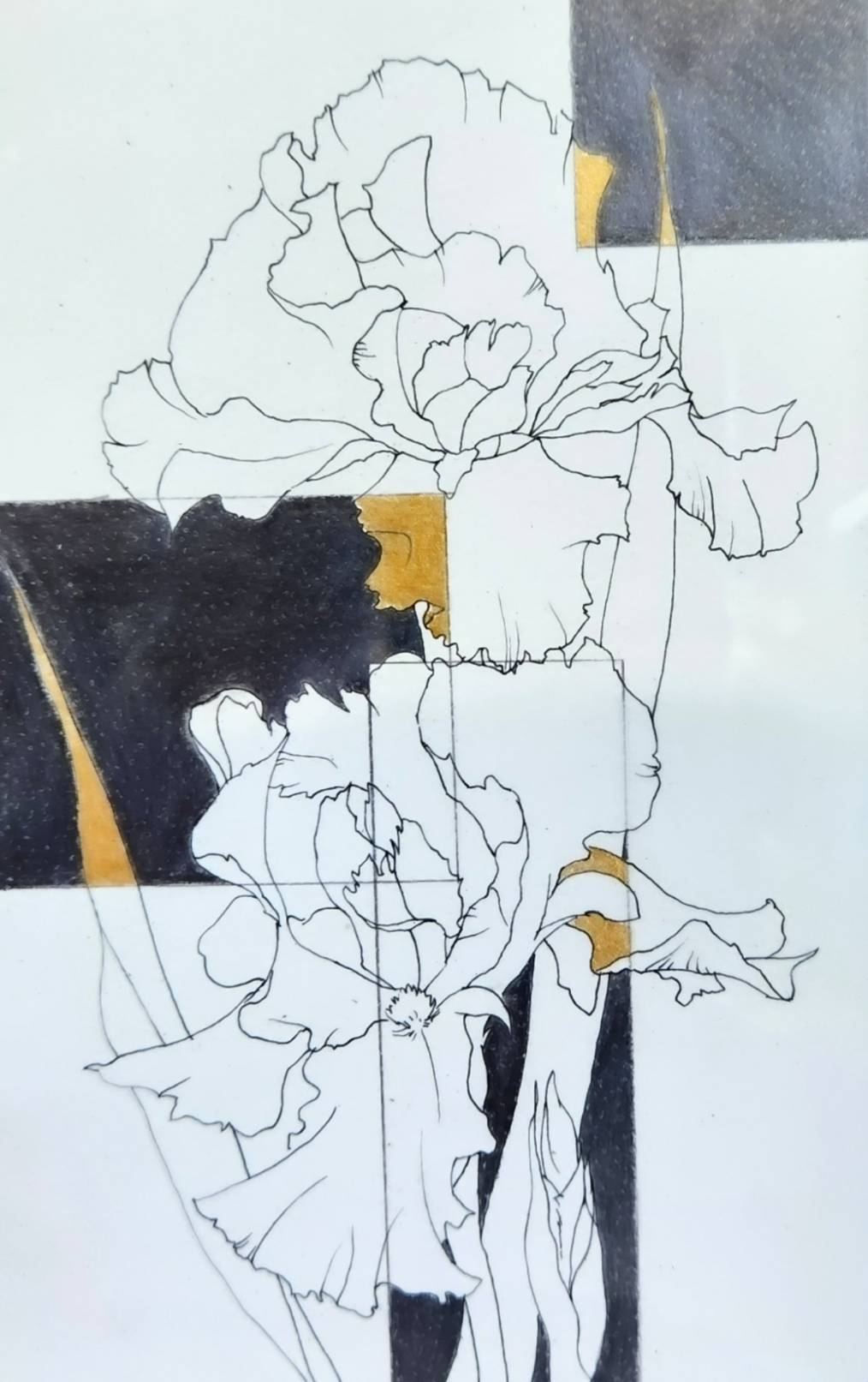 大胆に描かれたアイリスの花は、静かさの中にも意志を感じさせ、空間に緊張感と美しさをもたらします。