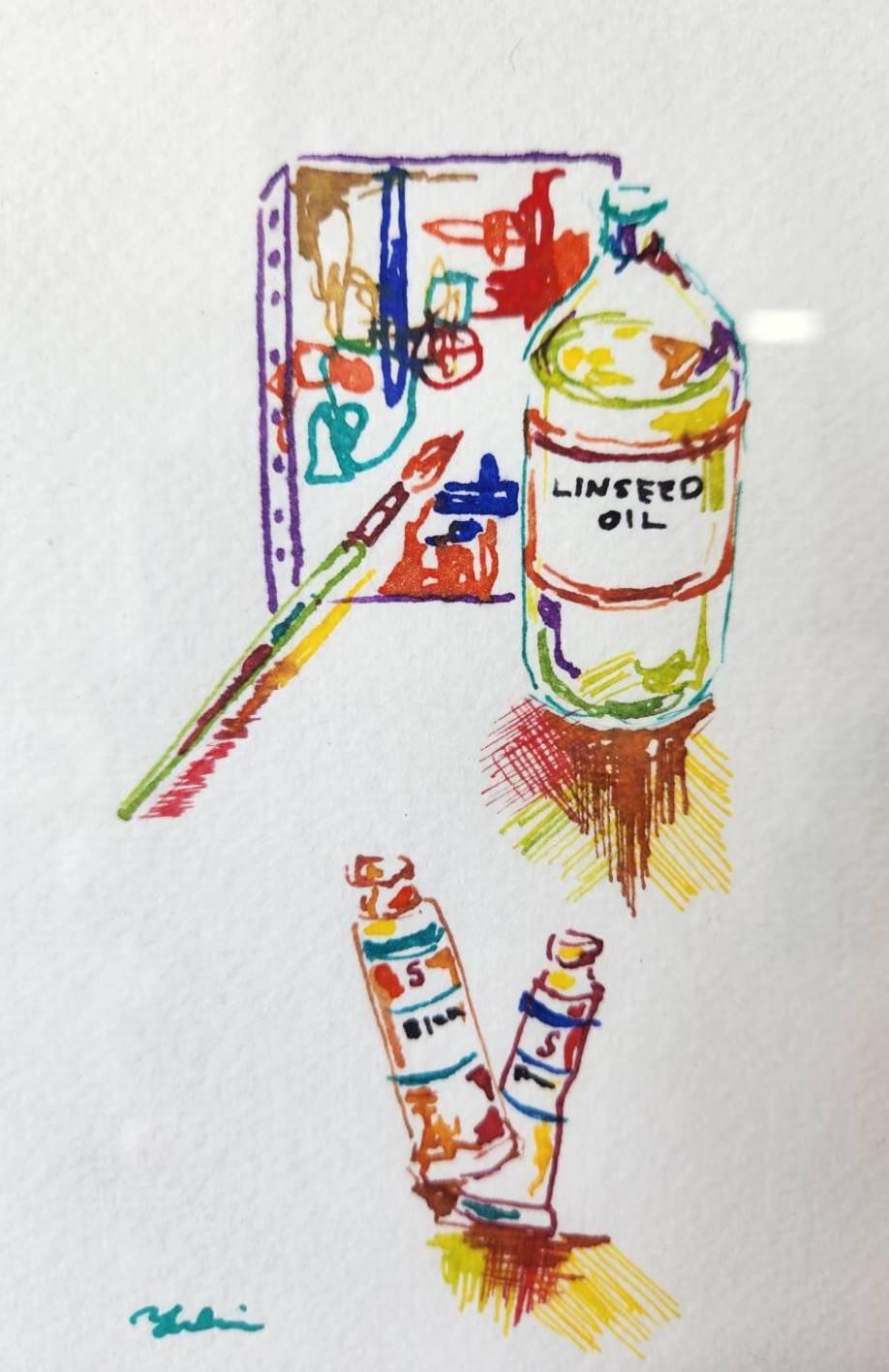 ペンで描かれた「油絵具の画材」。
