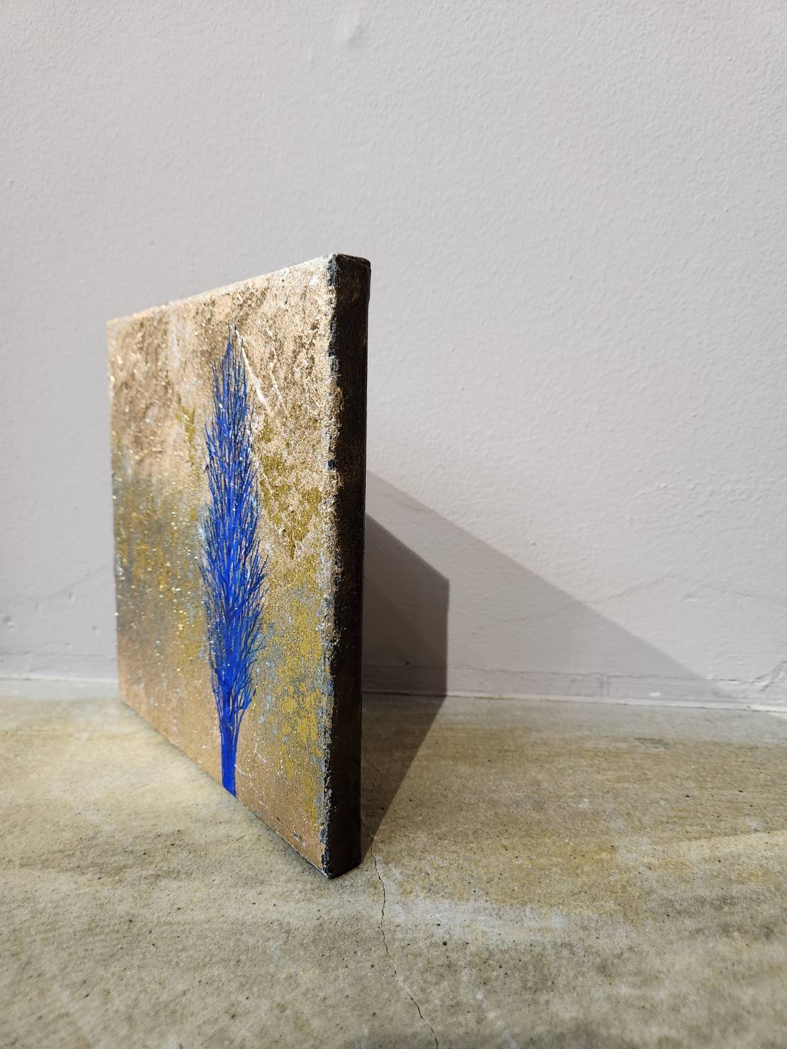 背景に広がるゴールドの輝きの中に、一本の木がブルーで描かれた印象的な作品です。