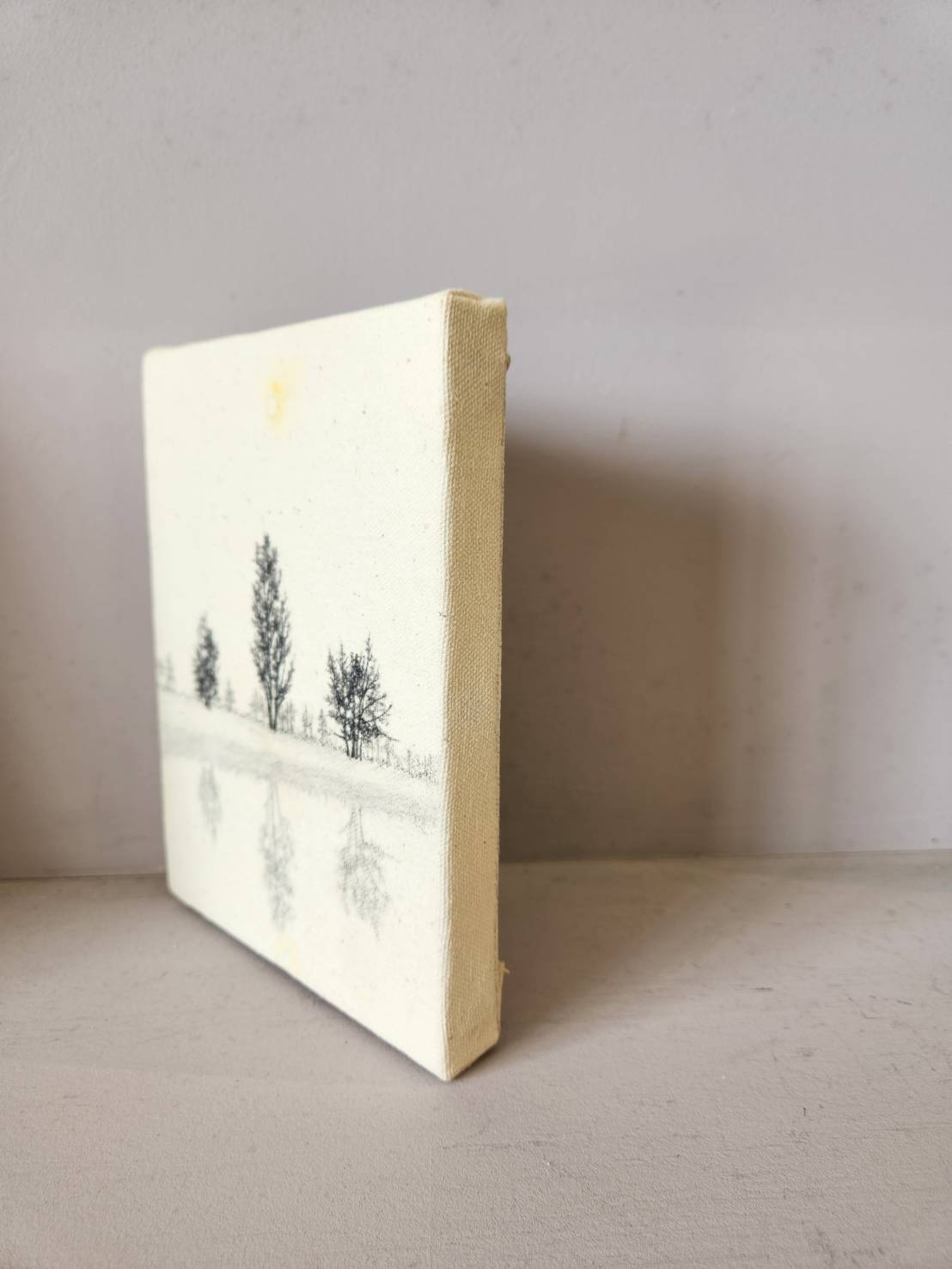 『夜に想う』は、木々や水面をあえて色で描かず、観る人それぞれの心の中に眠る情景を呼び起こすように仕上げた一枚です。
