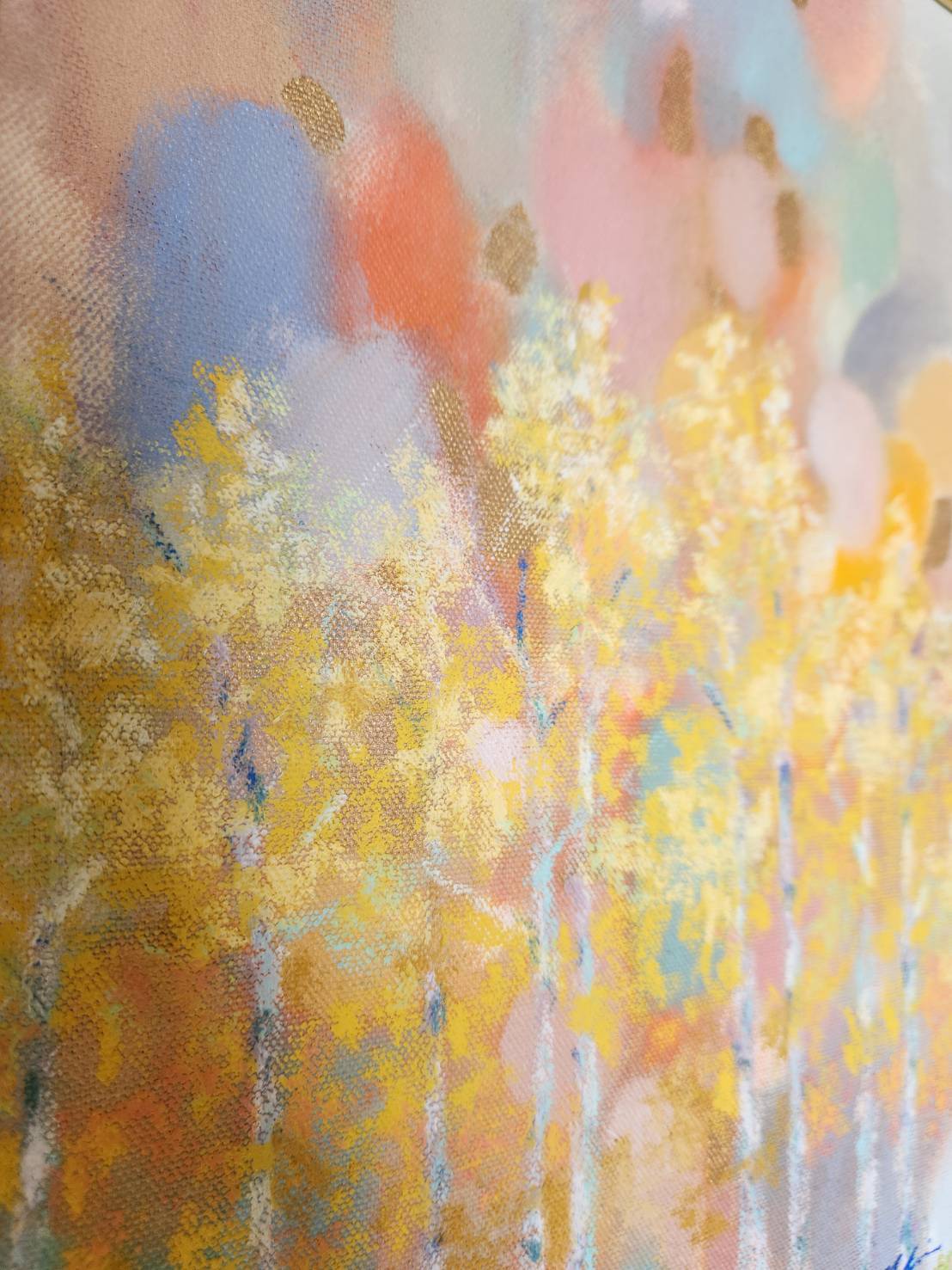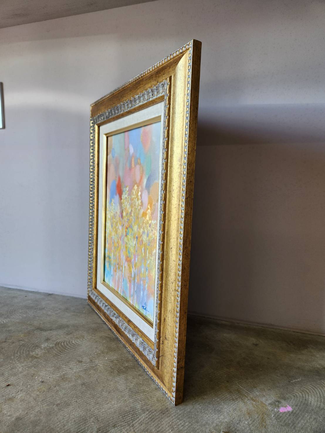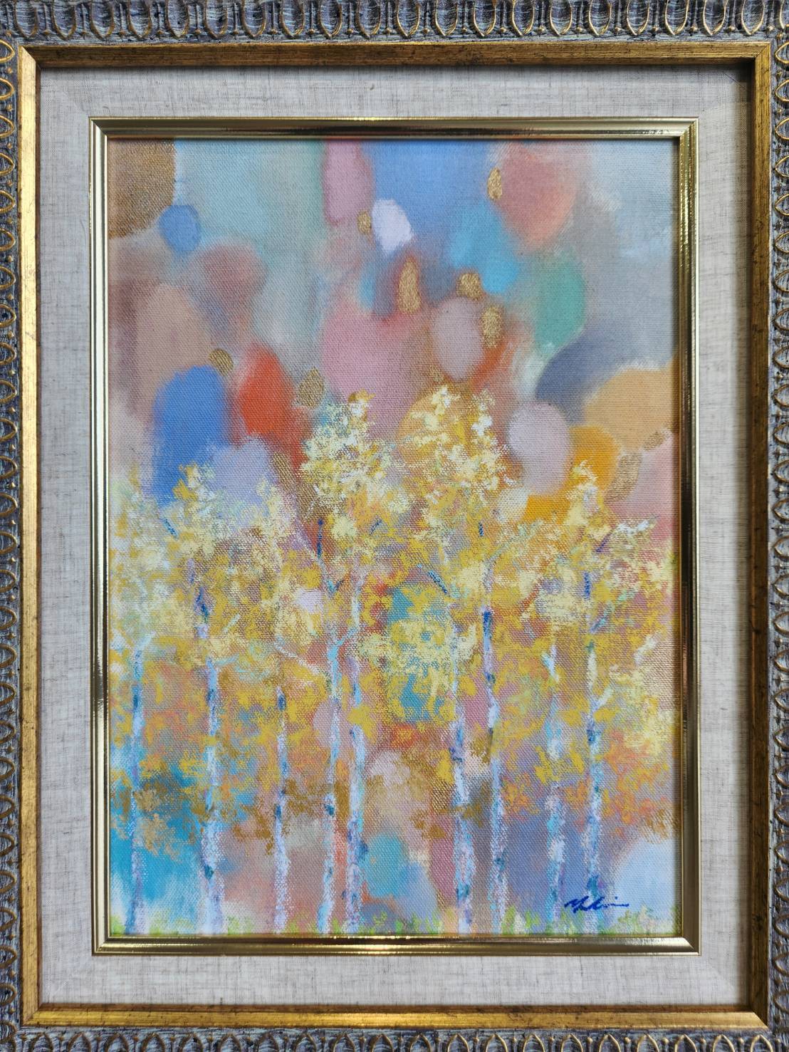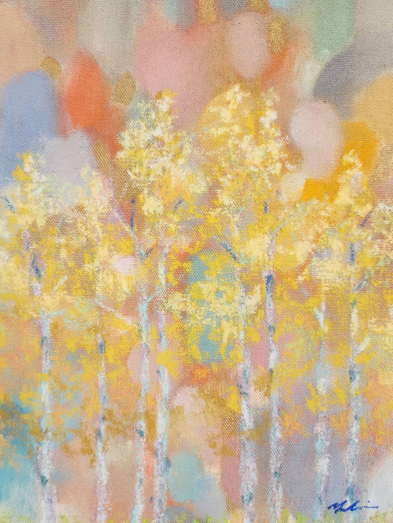 やわらかな秋の日差しを受けて、白樺の幹は静かに輝きを放ちます。その澄んだ白さは清らかさを象徴しながらも、周囲の景色と響き合い、落ち着きと高揚感を同時に与えてくれる存在です。本作では、オイルパステルと油絵の具を重ねることで、自然の奥行きや光の移ろいを豊かに表現しました。