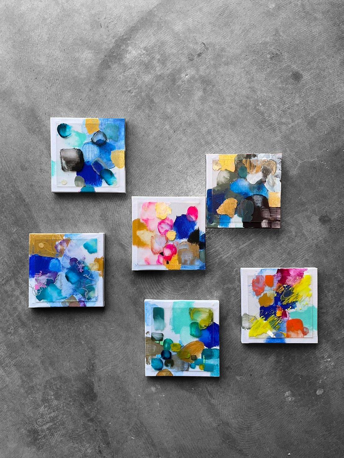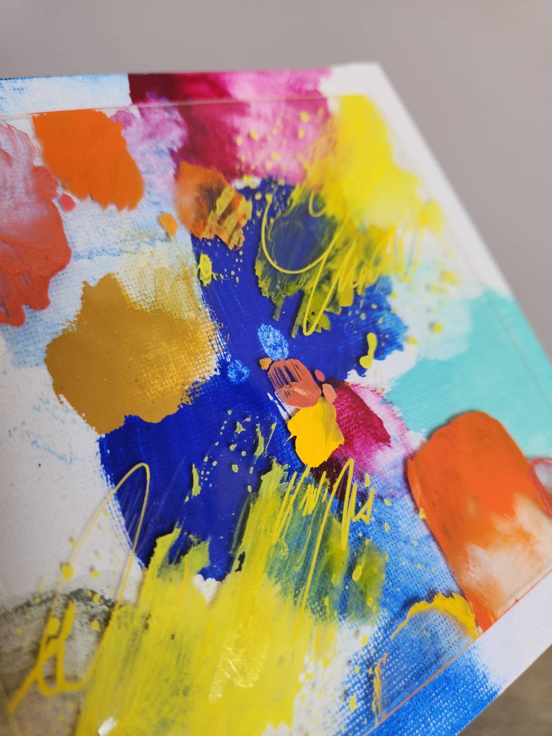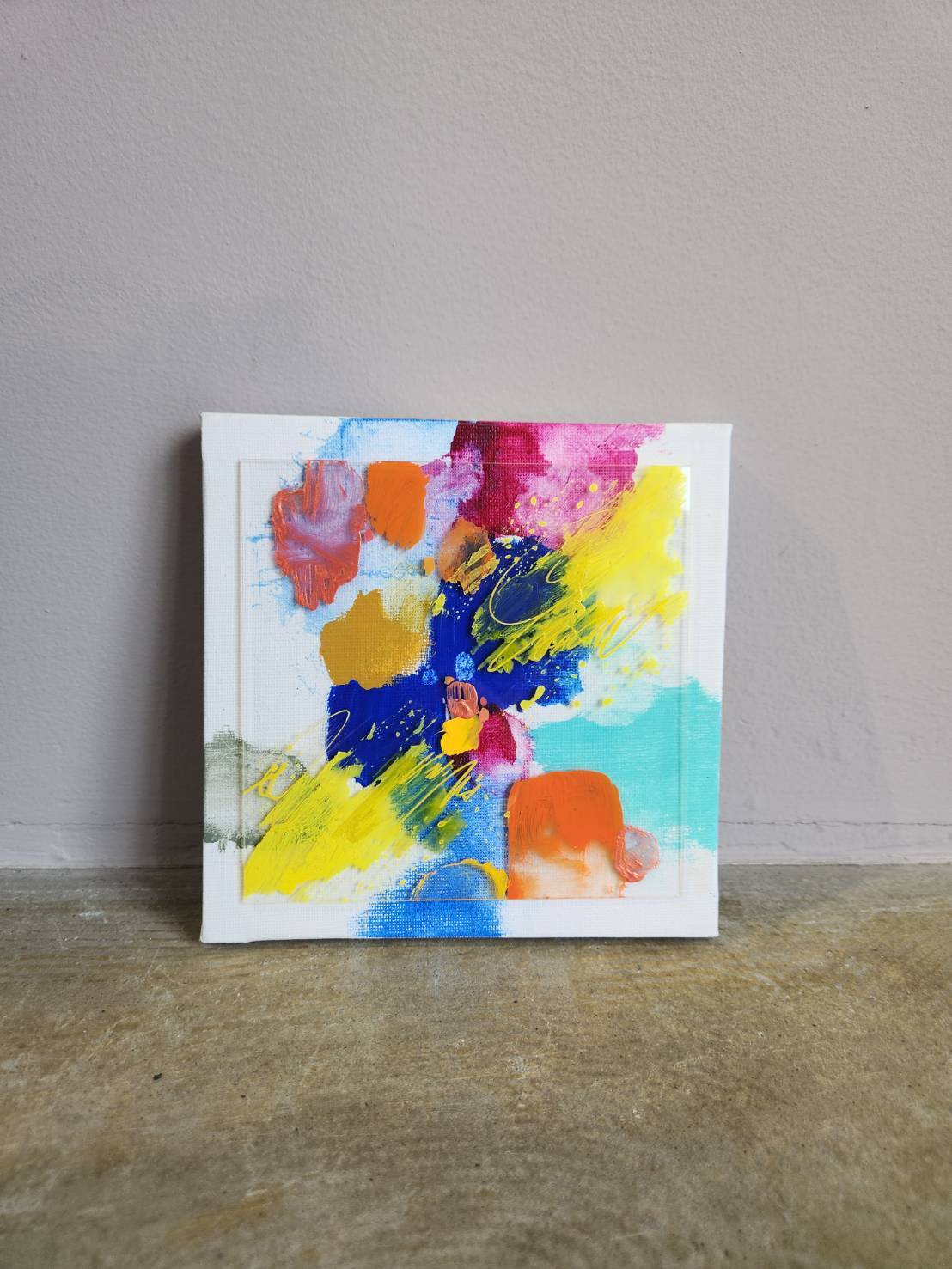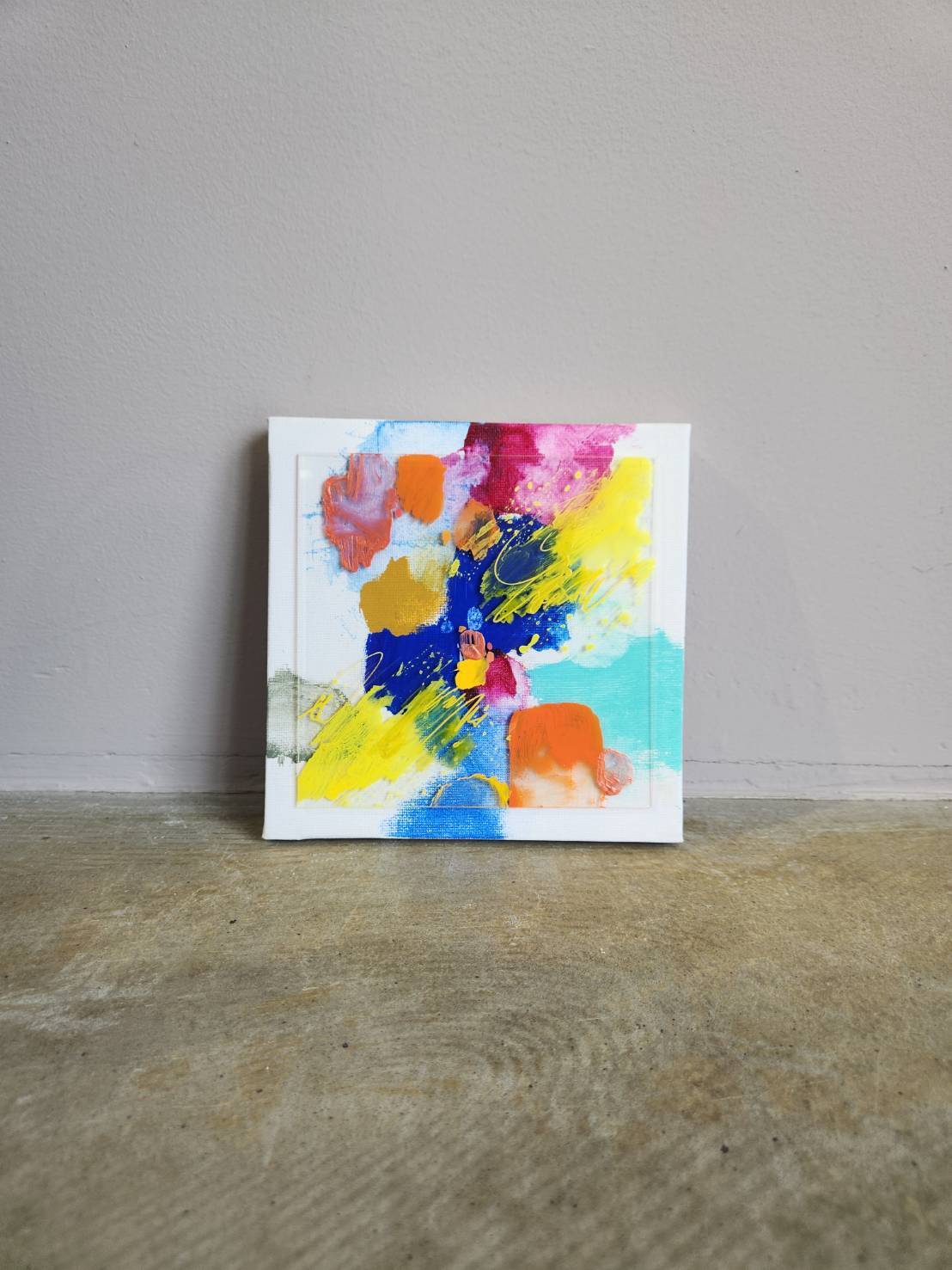 キャンバスの上に広がる鮮やかな色彩と、アクリル板を組み合わせることで生まれた奥行きと透明感。アクリル絵の具の自由な表情が、心の移ろいをやわらかく映し出しています。