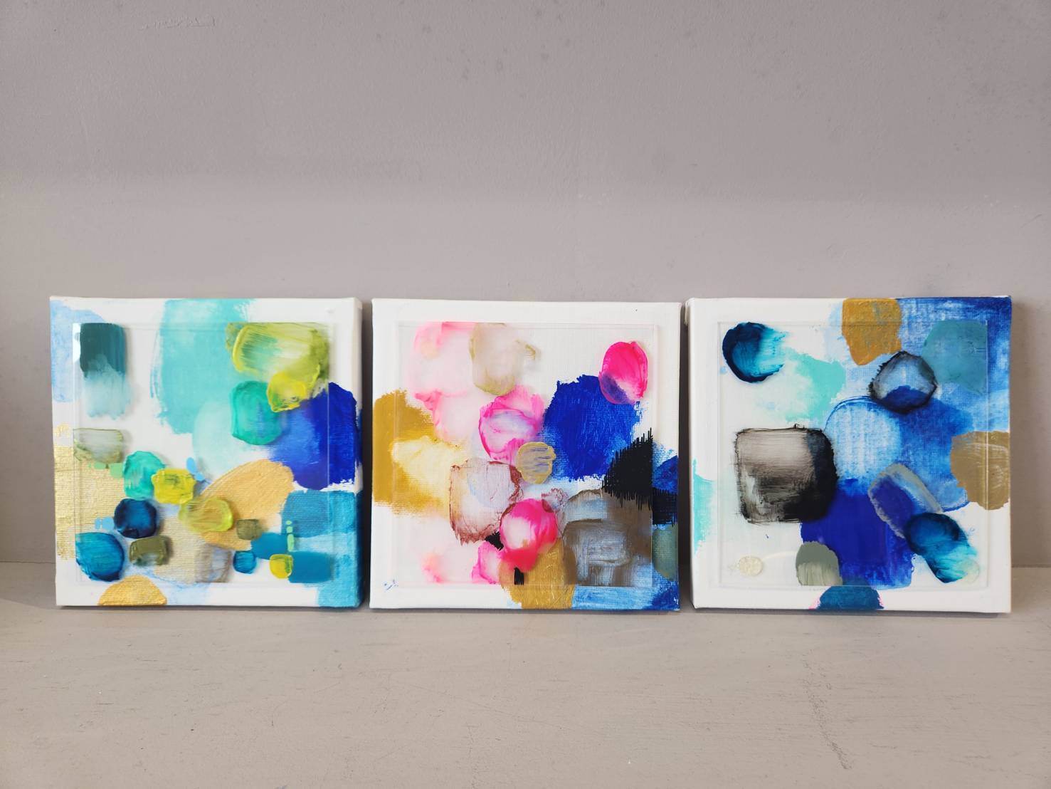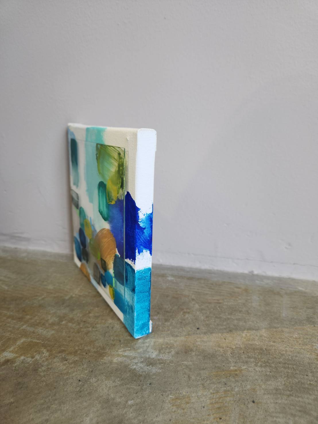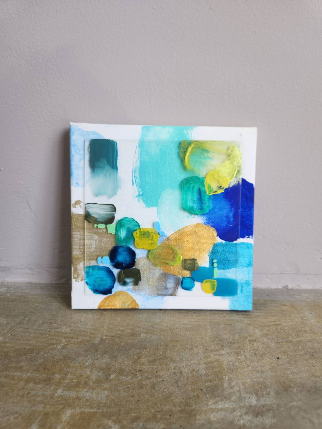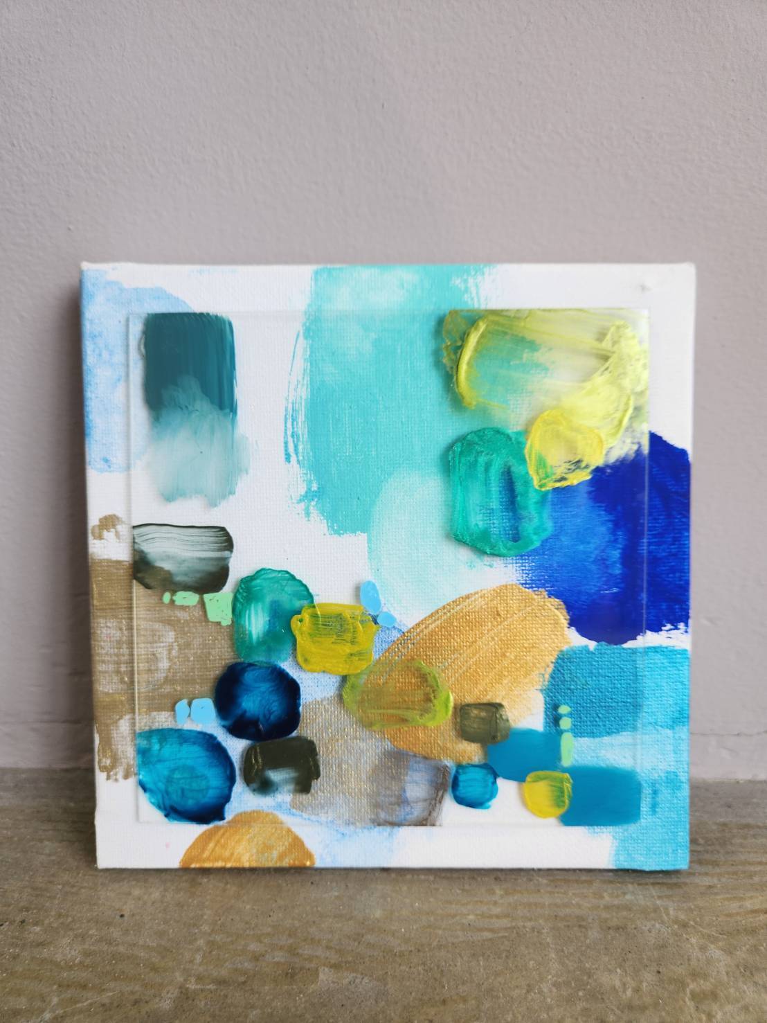 キャンバスの上に広がる鮮やかな色彩と、アクリル板を組み合わせることで生まれた奥行きと透明感。アクリル絵の具の自由な表情が、心の移ろいをやわらかく映し出しています。