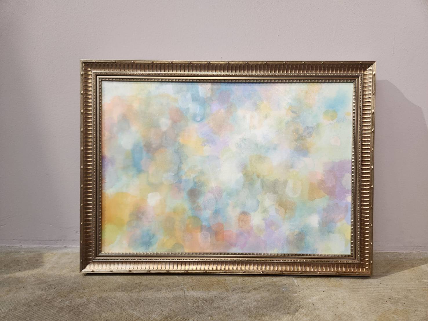 アクリル絵具と油彩を重ねて描かれた明るい色調は、見るたびに希望に満ちた気持ちにさせてくれます。自然光の下ではさらに輝きを増し、まるで絵画自体が呼吸しているかのように表情を変えます。