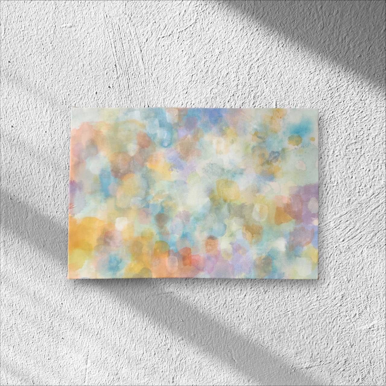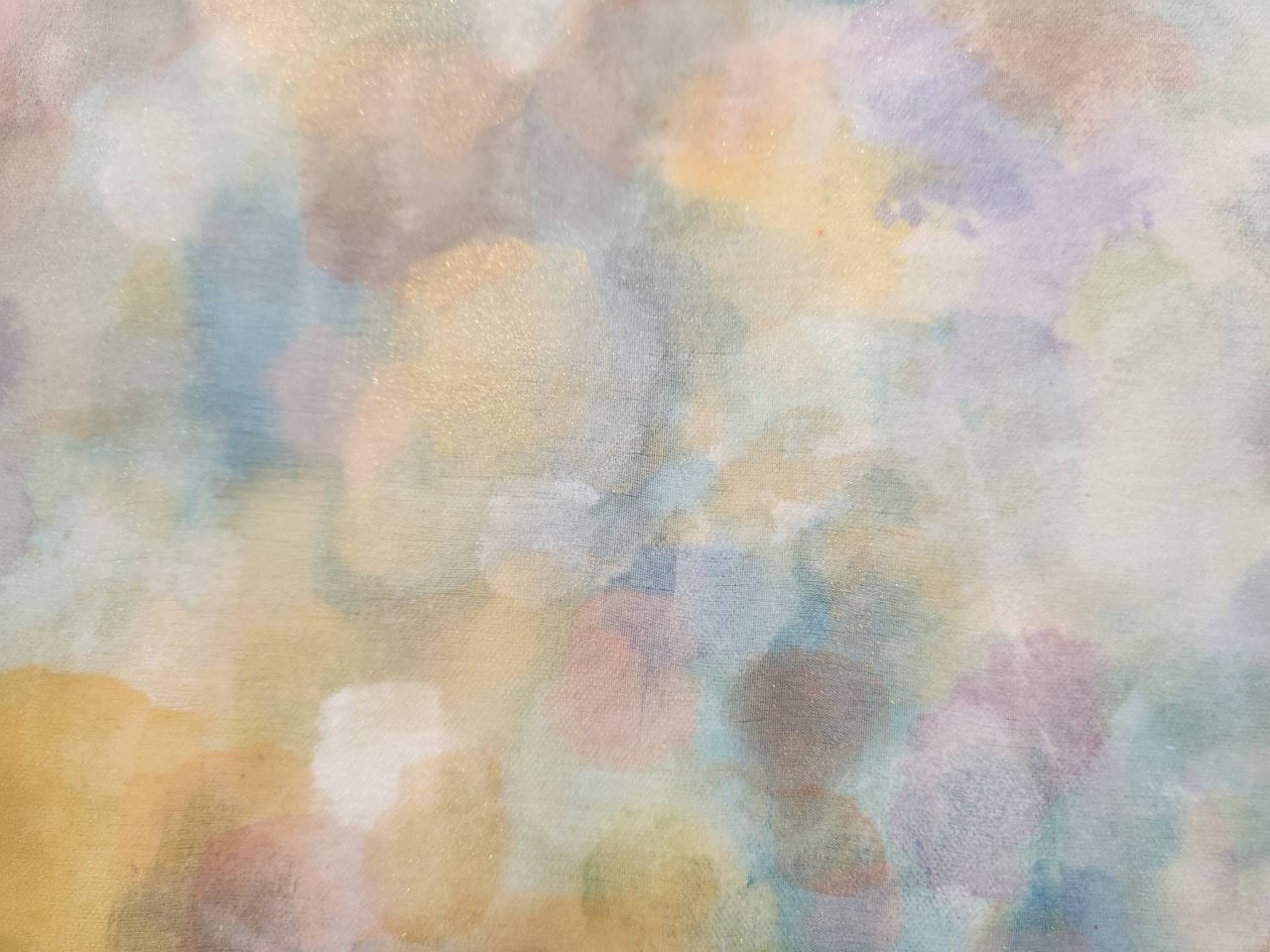 窓から差し込む木漏れ日のような、穏やかで心癒される抽象画です。キャンバスに重ねられた透明感のあるオーガンジーが、光の粒が降り注ぐ様子を繊細に表現しています。