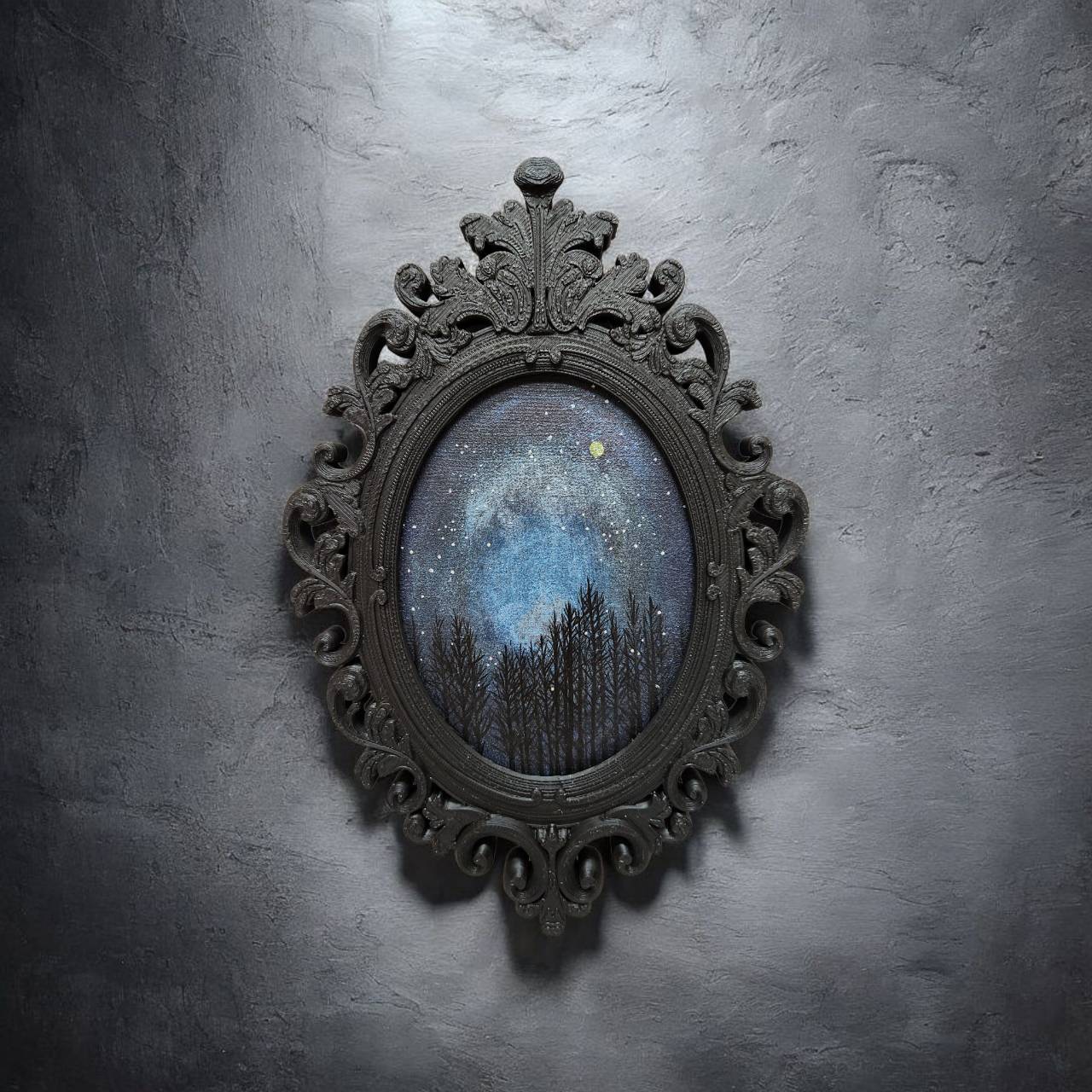 凍てつくような冬の夜、空気が澄み渡り、無数の星々が瞬く森の情景を描いた作品です。この絵を前にすると、まるでその場所に佇んでいるかのような空気感と、森の奥深くへと誘われる神秘的な感覚に包まれます。日々の喧騒から離れ、静かに心を落ち着けたい瞬間に、深く寄り添ってくれるでしょう。