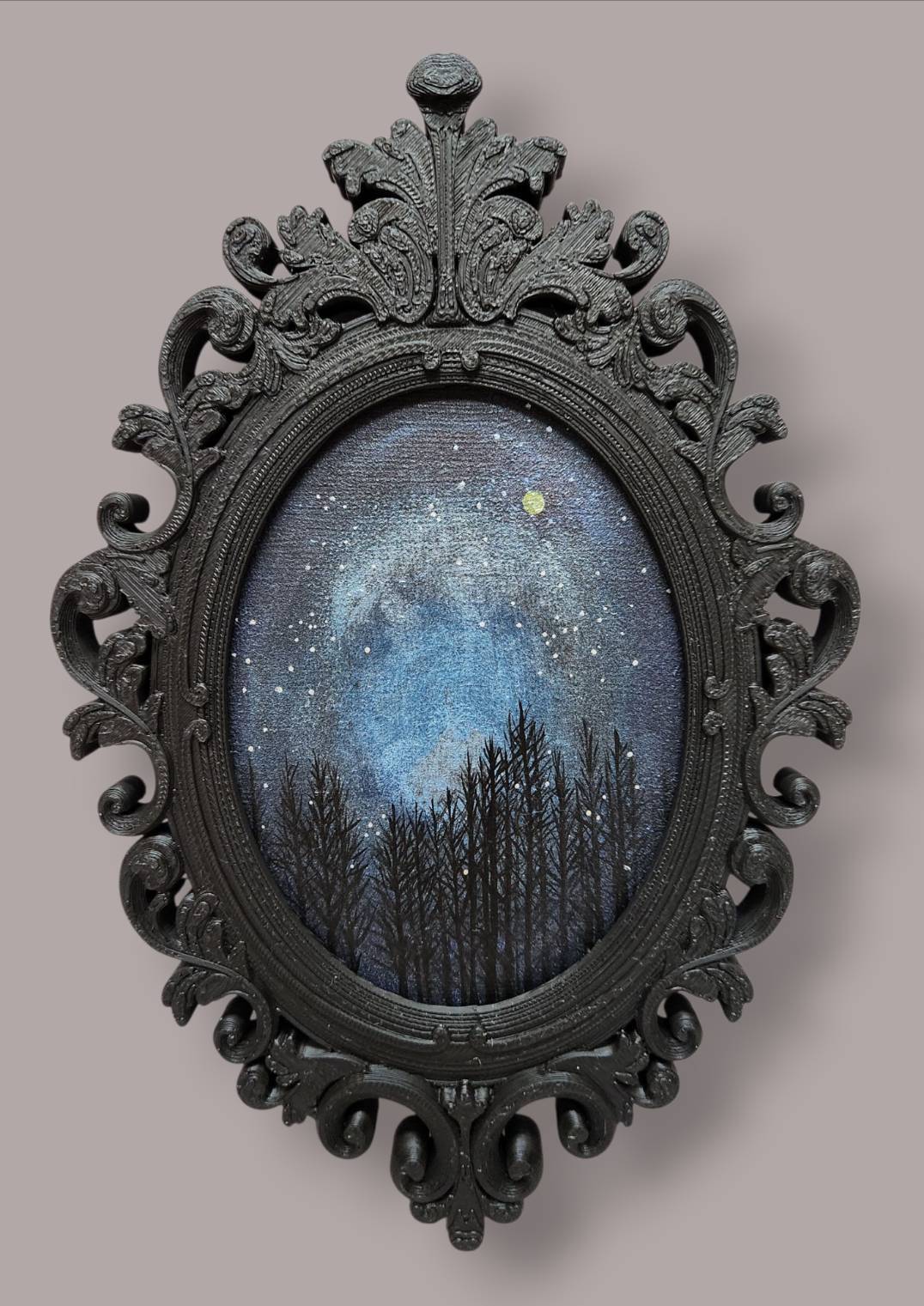 小さな画面に緻密に描かれた樹木、そしてメタリックカラーで表現された空や星々が、作品全体に幻想的で深みのある輝きをもたらしています。実物をご覧いただくと、その輝きはさらに増し、深みのある立体感と高級感を感じていただけます。