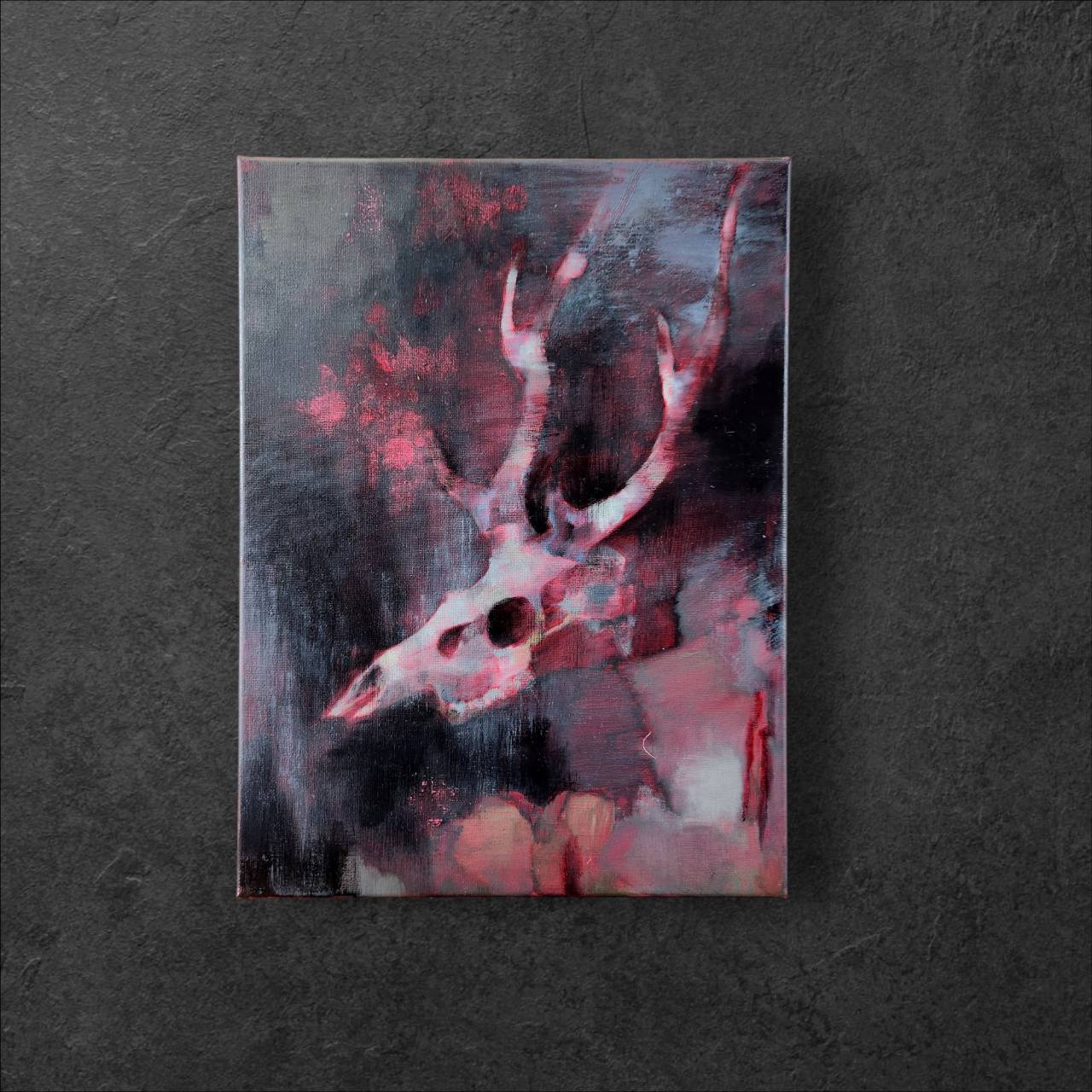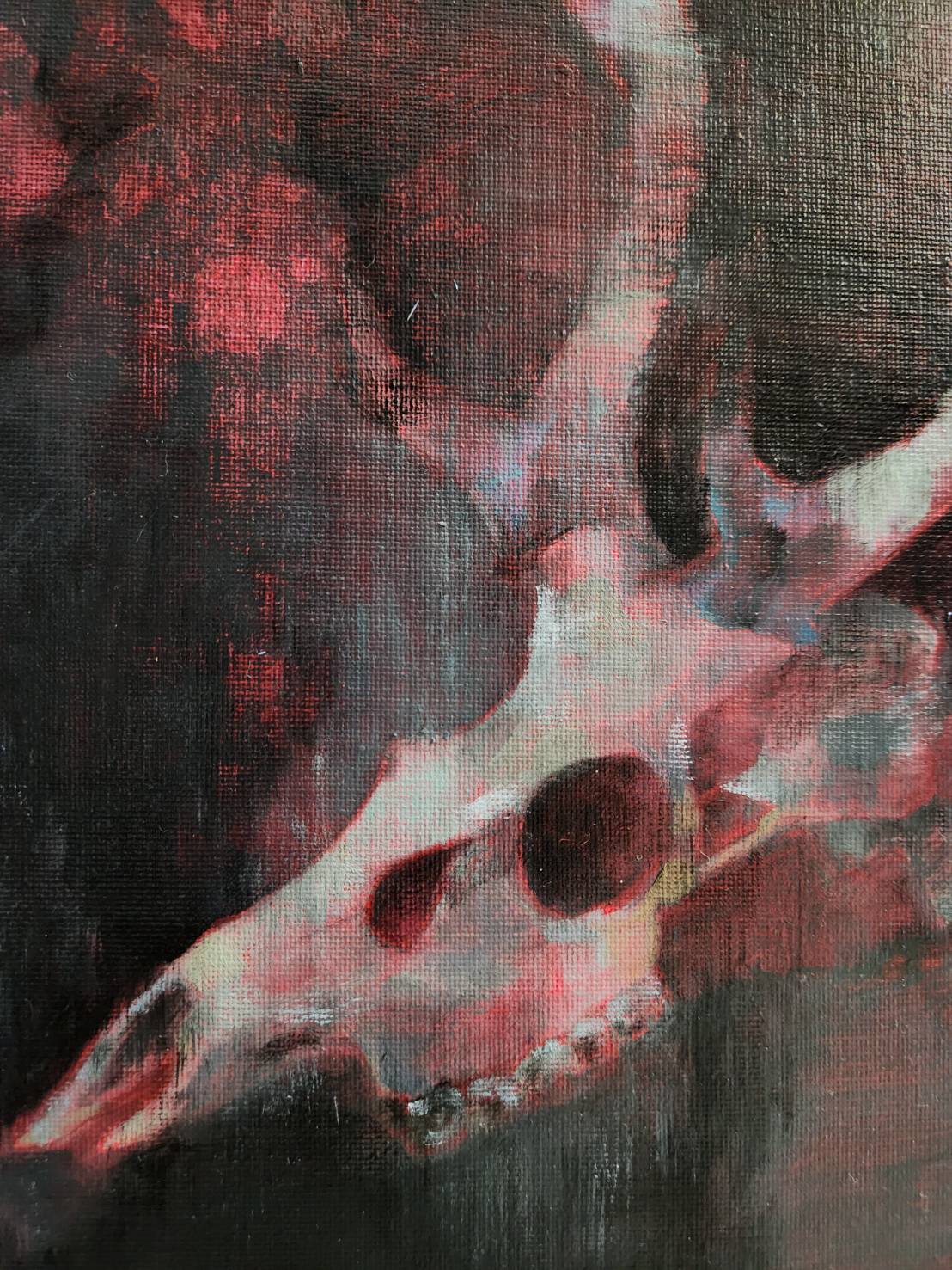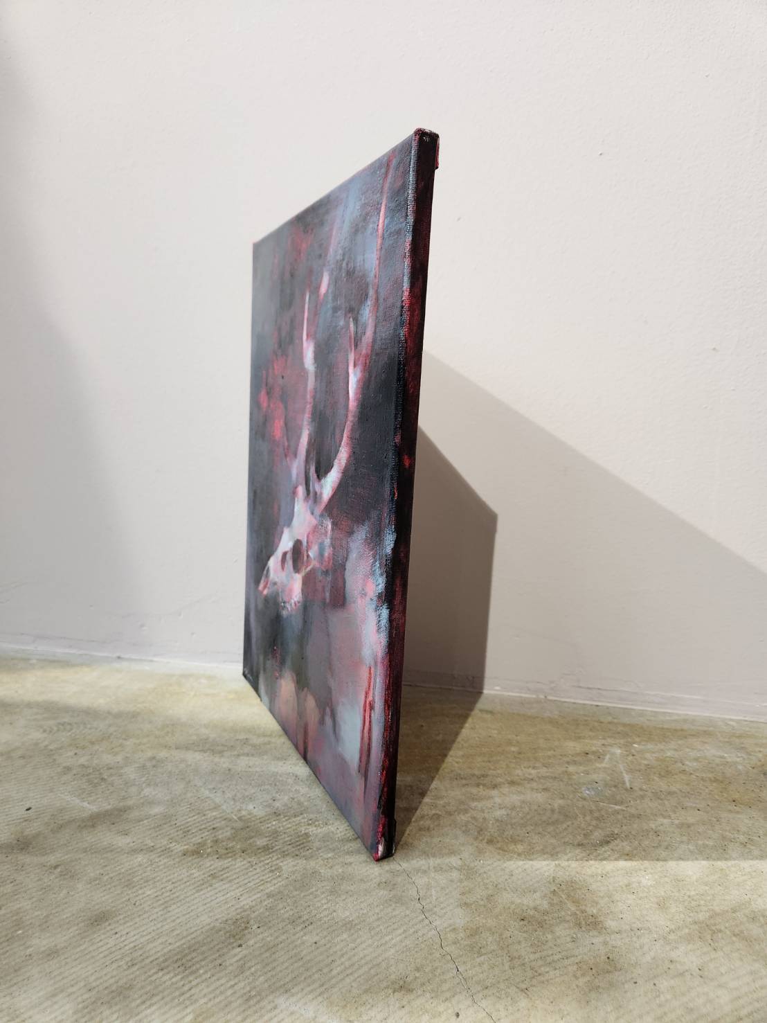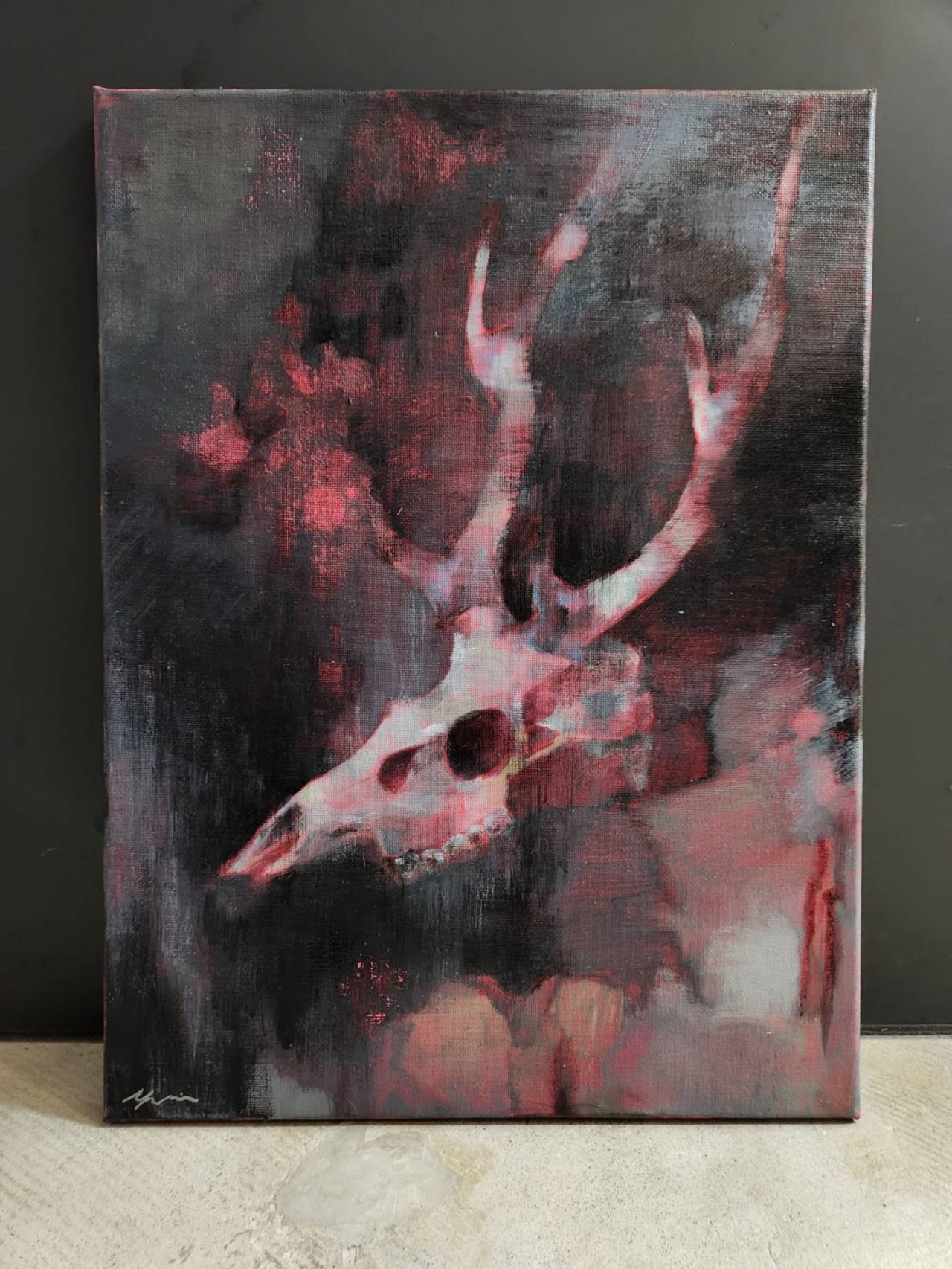 キャンバスに描かれたアクリル絵具の骨格に、油彩を重ねることで、作品に圧倒的な深みと重厚感を与えています。光と影が織りなす繊細な陰影は、骨の持つ造形的な美しさと、神秘的な雰囲気を際立たせ、見る角度によって異なる表情を見せてくれるでしょう。