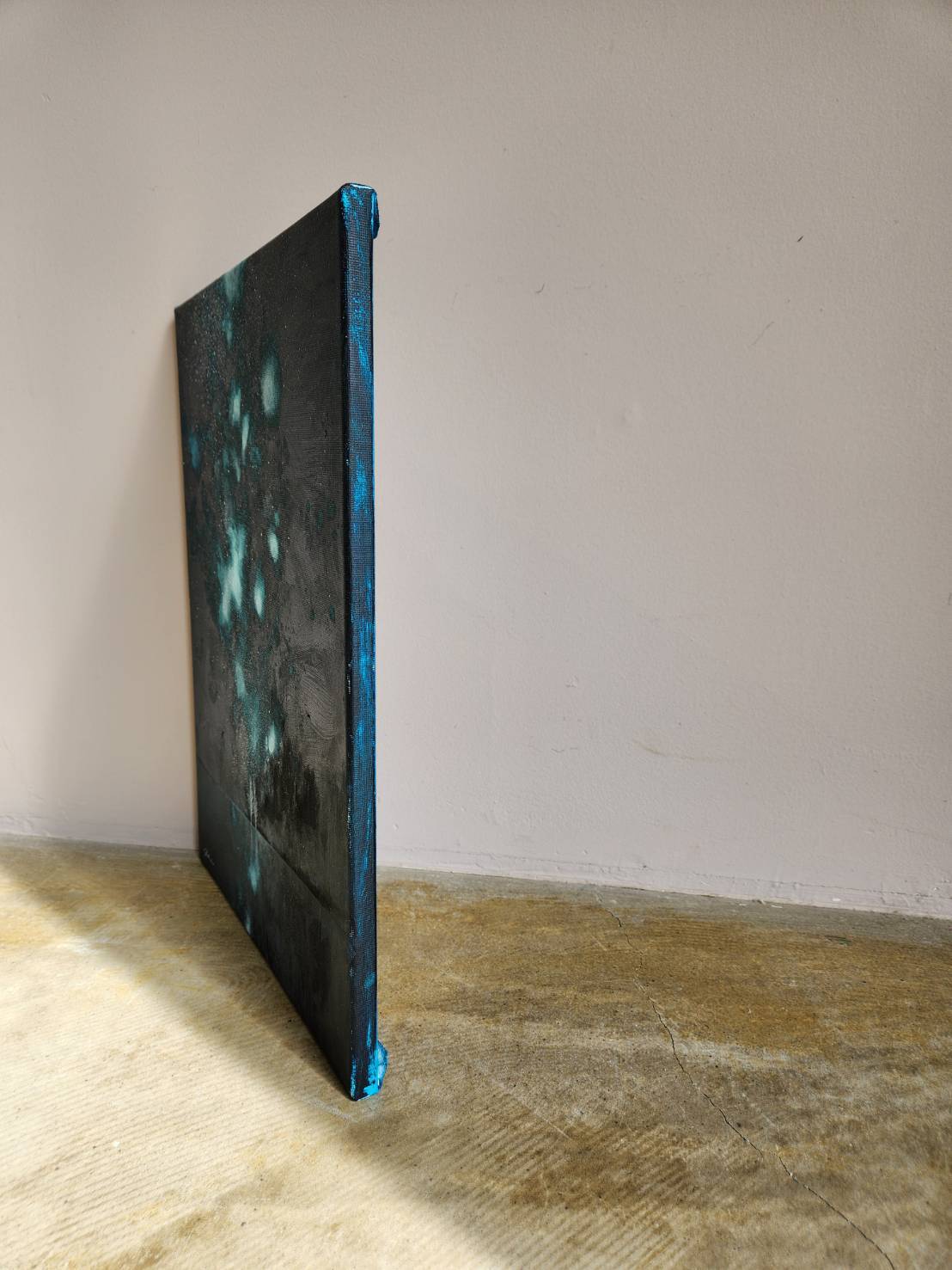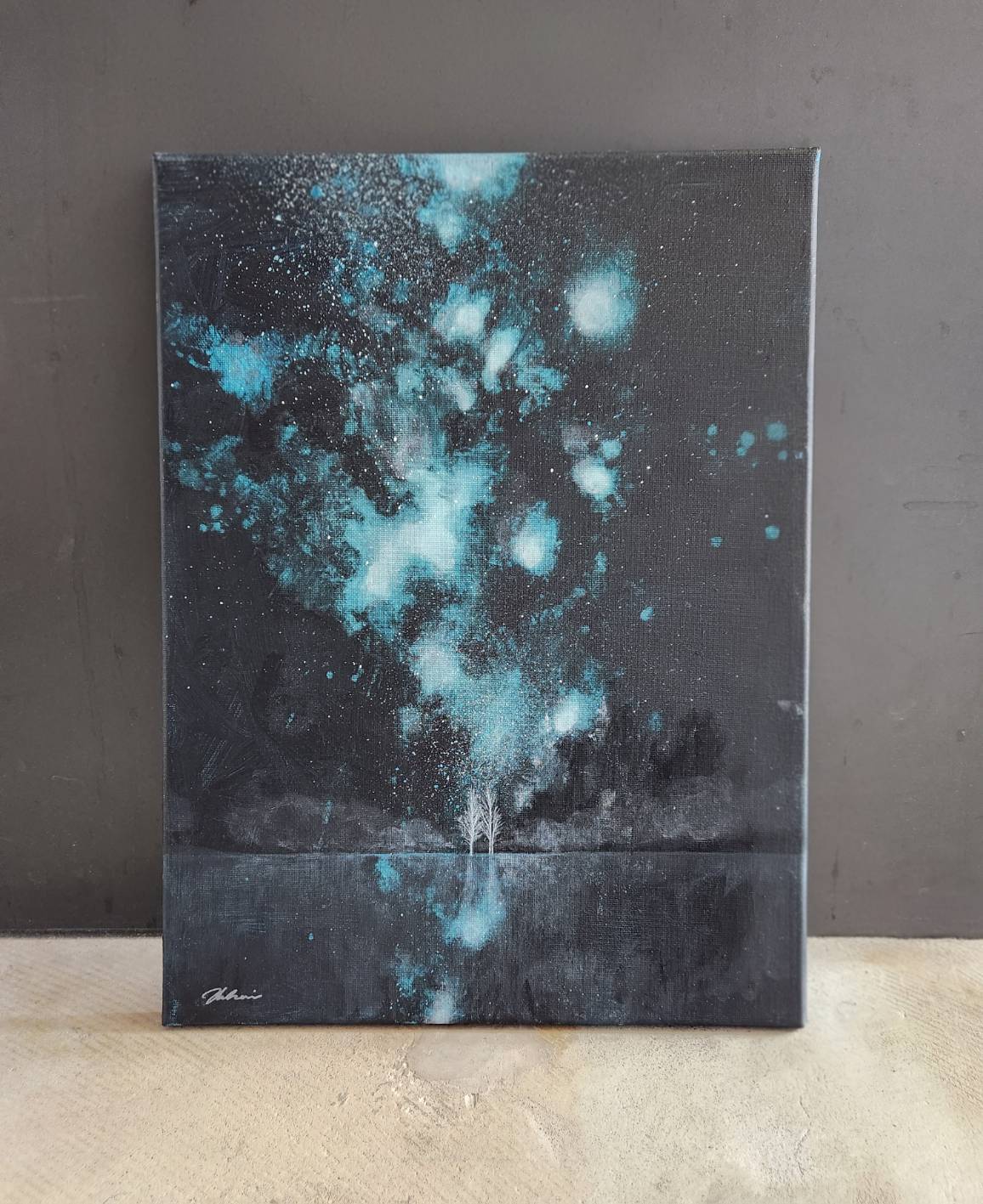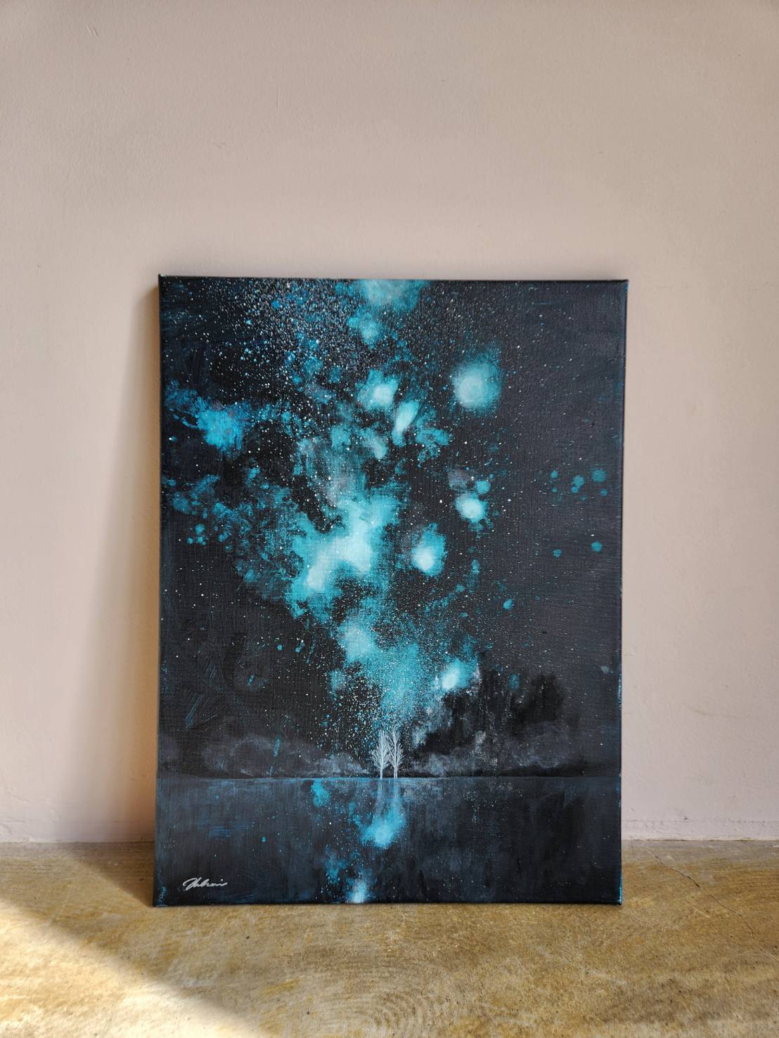 キャンバスに描かれたアクリル絵の具は、夜空の深い色合いと、星やオーロラの幻想的な輝きを鮮やかに表現しています。まるで夜空そのものが室内に持ち込まれたかのような、清らかで神秘的な雰囲気を演出します。実物の前では、その光彩の美しさが、作品に込めた深い情緒を一層際立たせてくれるでしょう。